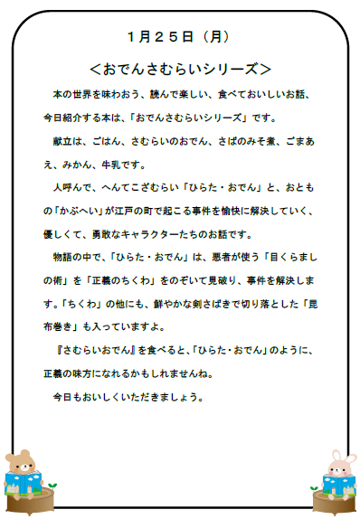 今日の献立は、「おでんさむらいシリーズ」に出てきた、さむらいのおでんです。歯ごたえの良い、昆布巻きやちくわが入っていて旨味がでていて美味しかったです。みんな、ちくわの穴を覗いてみたりと楽しく食べていました。