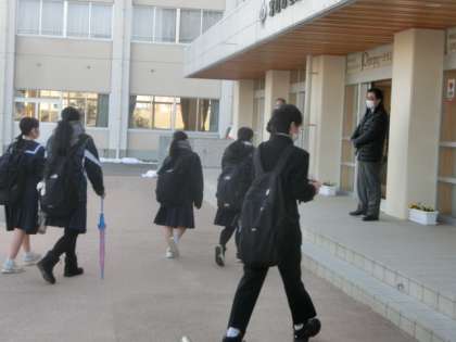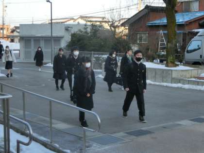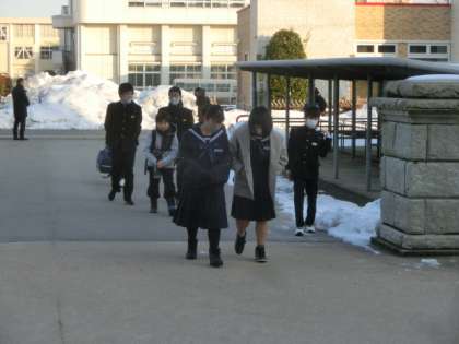 放射冷却で路面が凍結していましたが、生徒たちは足下に気を付けて登校しました。