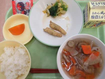 ごはん こ鰯の天ぷら 昆布和え こんこん汁 伊予柑 節分豆 牛乳