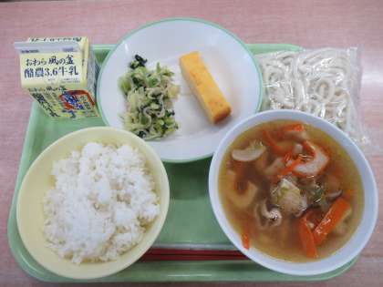 ごはん 厚焼き玉子 はりはり和え かやくうどん 牛乳
