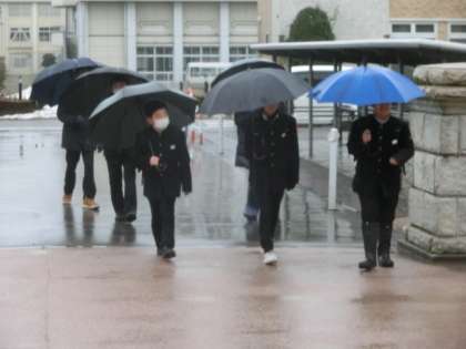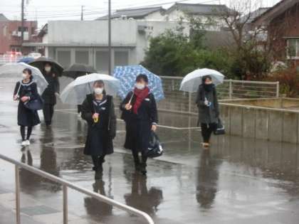 週末の陽気が嘘のような雨ですが、生徒たちは元気に登校しました。