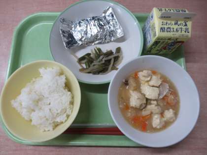 ごはん 鯖の銀紙焼き 茎ワカメのキンピラ 海老と野菜の旨煮 牛乳