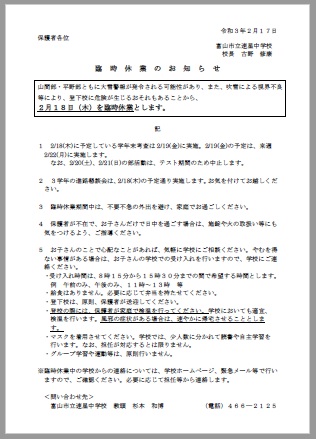 大雪警報が発令される可能性があり、登下校に危険が生じるおそれもあることから、2月18日(木)を臨時休業とします。