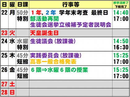 2月21日(日) 週予定