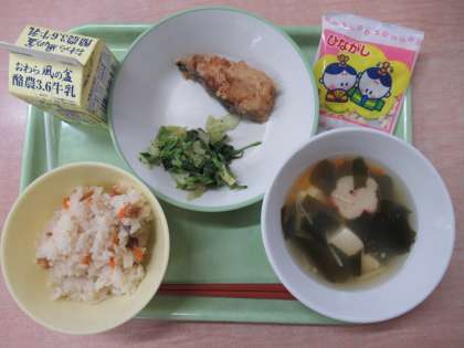 ちらし寿司 揚げ魚のみぞれだれ なばなのおひたし すまし汁 ひながし 牛乳