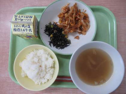 ごはん 大豆と白エビのカリカリ揚げ ひじきのゴマ和え 白菜スープ 牛乳