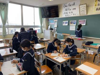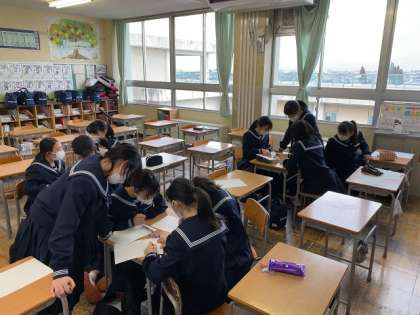 卒業式当日、3年生教室に飾る祝画の制作が始まりました。今日は、各学級から集まった希望者がデザインを考え始めました。3年生の皆さん、当日を楽しみにしていてください。