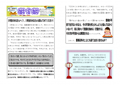 相談室だより第12号(3月)をアップしました。今回は、受検を間近に控えた3年生に向けた話(だけど、実は1,2年生にも当てはまるであろう話)を紹介しています。