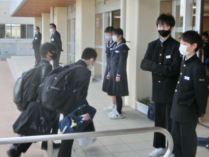 3月最初の登校は、春!予想最高気温20度の温かな天候の中、生徒たちは元気に登校しました。玄関では、生活向上委員会の1年生が爽やかな挨拶で全校生徒を出迎えました。