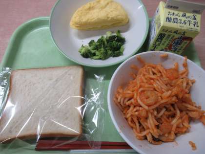 減量食パン 海老とトマトのクリームスパゲティ 茹でブロッコリー オムレツ 牛乳
