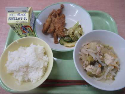 ごはん 白菜鍋 茎わかめサラダ ワカサギの胡麻ダレかけ 牛乳