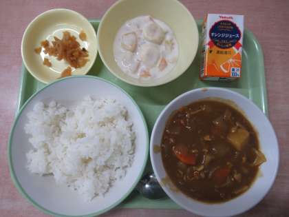 ごはん カレールウ 福神漬け フルーツヨーグルト オレンジジュース