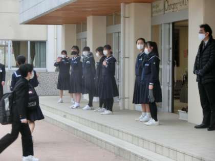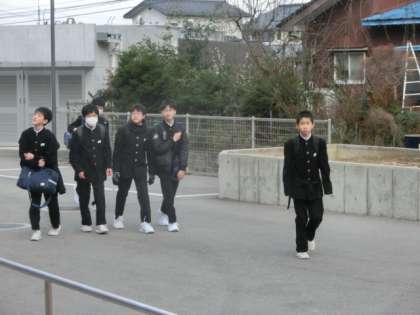 3月10日(水) 登校風景 公開日 2021/03/10 更新日 2021/03/10 全学年 日に日に温かさを感じられるようになってきました。生徒たちは、今朝も元気に登校しました。玄関では、生活向上委員会の2年生が爽やかな挨拶で全校生徒を出迎えました。