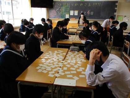 3月5日(金) 3年 最後の特別授業 公開日 2021/03/12 更新日 2021/03/12 3年生 今日の1〜5限は、3年生の教員による最後の授業でした。百人一首大会、カルメラ焼きを作ってみよう、オモシロ音楽鑑賞、SDGsゲーム、正多面体で飾りを作ろう、震災講話等、多彩な授業を受けました。 話を聞いて涙を流したり、ゲームで仲間と盛り上がったりと、「濃い」一日を過ごすことができました。