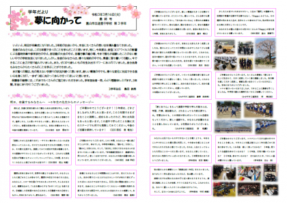 3学年だより最終号(第10号)をアップしました。内容は、「明日、卒業するみなさんへ 3年生の先生からのメッセージ」です。思い出の写真も添えています。ぜひ、ご一読ください。