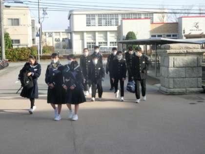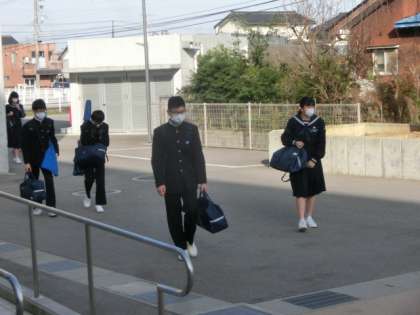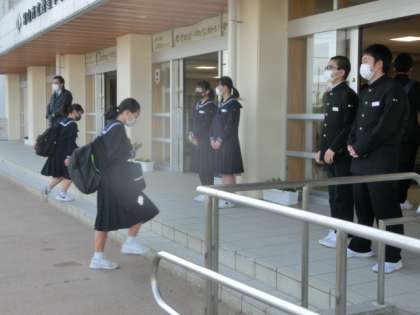 1,2年生だけになって初めての登校。少し寂しさも感じられましたが、玄関では生活向上委員会の1年生が爽やかな挨拶で全校生徒を出迎えました。