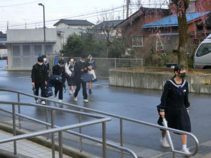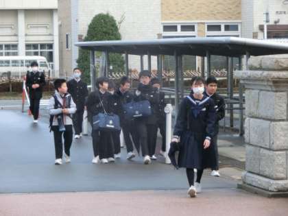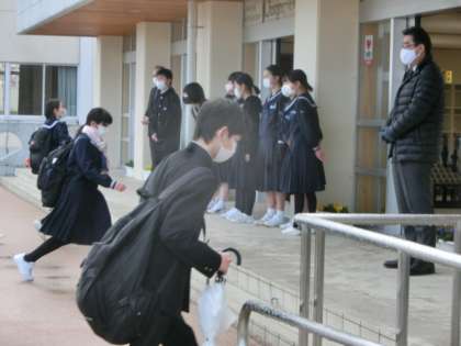 令和2年度の登校最終週の初日。週末の雨でしだれ梅は花を落としましたが、入れ替わりでしだれ桜が花を咲かせました。玄関では、生活向上委員会の2年生が爽やかな挨拶で全校生徒を出迎えました。