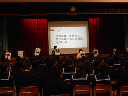 次に、1学年スタッフによる「チーム速星1学年 あいうえお作文」の発表を行いました(中段)。