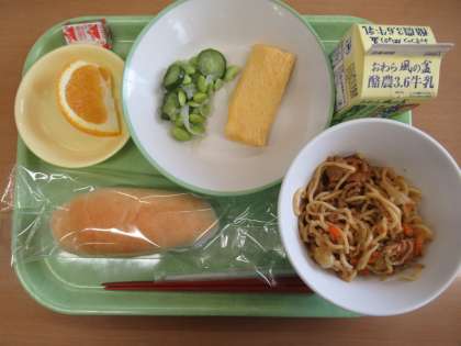 牛乳 減量コッペパン 枝豆のマリネ 卵ロール 焼きそば ポケットチーズ 甘夏みかん