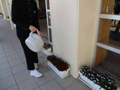 今週は毎日よい天気が続いています。ボランティア委員会の生徒がプランターの花に水やりをしてくれていました。本日の下校完了時間は18:00です。
