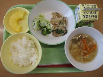 春雨スープは、具がたくさん入っていて、いろいろな食感が楽しめました。豚肉のおろし炒めは、ゴマの風味が感じられ、とてもおいしく、ごはんに合いました。カットパインは、甘くて、ジューシーでした。 給食委員長 出戸