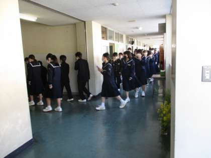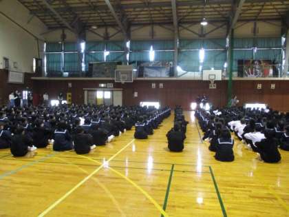 今日、今年度最初の避難訓練が行われました。1年生は体育館、2、3年生は、スポーツプラザソフトボールAコートの西側と東側にそれぞれ避難しました。写真は1年生の様子です。全員、真剣に取り組んでいました。
