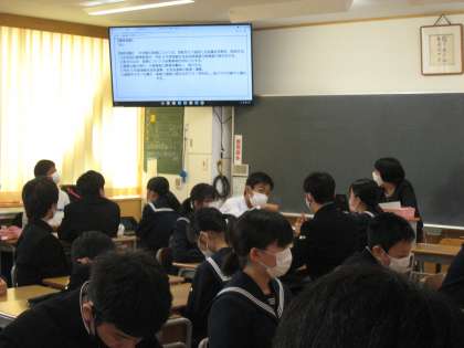 33Hの生徒総会の様子です。タブレット・モニターで資料を確認しながら、各委員会の活動について説明を受けています。