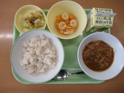 麦ごはん 牛乳 カレールゥ 福神和え フルーツポンチ