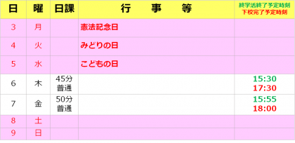 5/3(月)〜5/9(日)までの予定は、以下の通りです。
