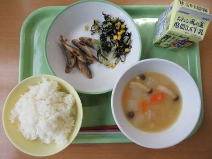 小あじのから揚げは、さくさくしていて、おいしかったです。ひじきのマリネは少し酸味がありましたが、コーンの甘味とよく合っていました。ポトフは大根やじゃがいもなどの野菜がとても柔らかかったです。今日はテストでたくさん頭を使い、つかれていましたが、給食で元気が出ました。 給食委員長 出戸