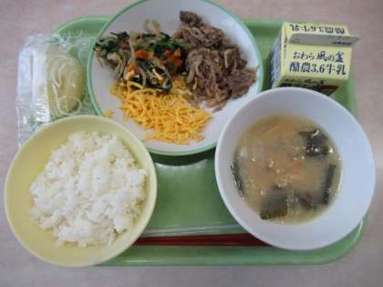 ごはん 牛乳 ビビンバ(焼肉、ナムル、錦糸卵)味噌汁 冷凍ラフランス