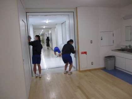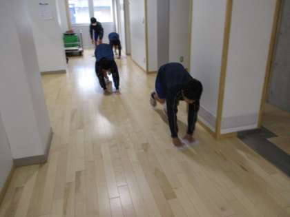 ソフトテニス部男女が、雨で朝練ができなかった代わりに、1階の廊下を中心に清掃ボランティアを行っていました。ありがとうございます。