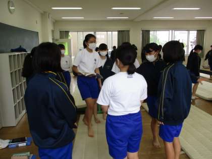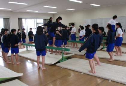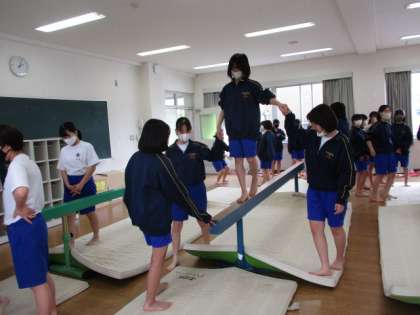5月21日(金) 授業風景 公開日 2021/05/21 更新日 2021/05/21 全学年 5限に1年生と3年生の体育の合同授業がありました。15・16Hと35・36Hの女子で授業内容は平均台の演技です。3年生が1年生にアドバイスや演技のサポートをしながら進めます。みんなとても楽しそうに授業に参加していました。