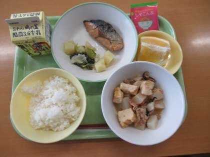 ごはん 牛乳 ふくらぎの照り焼き じゃがいもの千切り炒め かぶと厚揚げの中華煮込み 河内晩柑 しそこんぶふりかけ