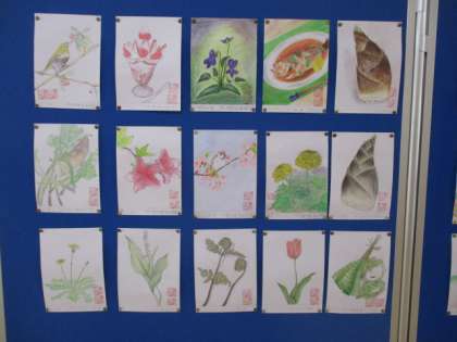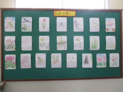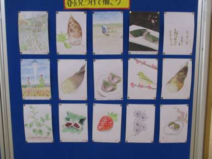 5月25日(火) 校舎内の掲示物から 公開日 2021/05/25 更新日 2021/05/25 全学年 玄関を入り職員室へ向かう途中の右手の掲示板とB棟の1階から2階の踊り場に1年生の「春を見つけて描こう」と題した美術作品が展示されています。タケノコやたんぽぽの花などどの作品も気持ちが温かくなるものばかりでした。