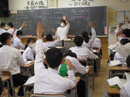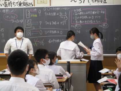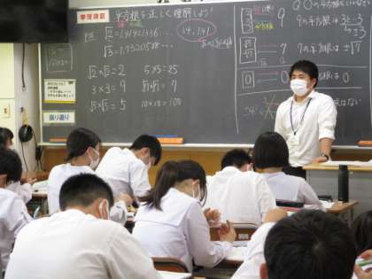 5限、37Hで教育実習生の数学の授業が行われていました。平方根について学んでいます。問題の解答を黒板に書く場面では、みんな積極的に挙手していました。