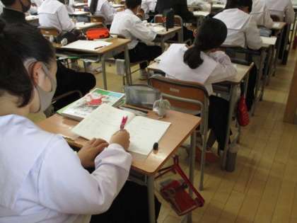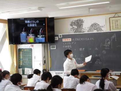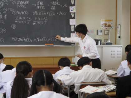 3限、27Hは教育実習生による理科の授業が行われていました。学習課題は「化学反応式になれよう」です。みんな先生の説明をしっかり聞いていました。