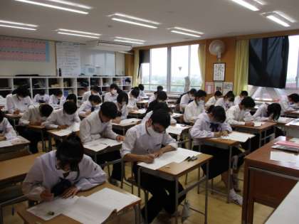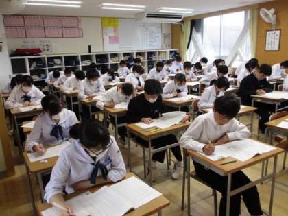3年生は全国学力・学習状況調査を行いました。国語と数学の学力調査と質問紙(学習状況に関するアンケート)に答えます。写真は1限の国語の様子で上から32H・33H・34Hです。