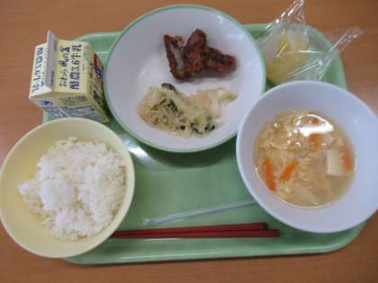 ごはん 牛乳 かきたま汁 ちくわの南部揚げ 春雨サラダ 冷凍りんご
