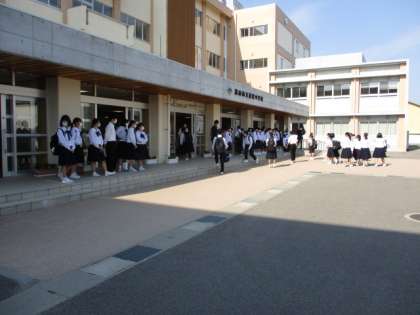 今朝は登校時間帯から暑くなりました。玄関では吹奏楽部が挨拶運動をしていました。今日の下校完了時間は13:20です。