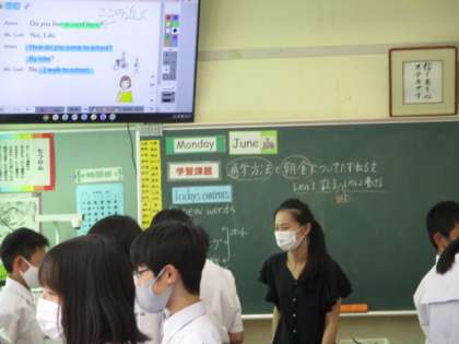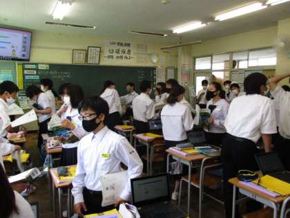 6月7日(月) 授業風景 公開日 2021/06/07 更新日 2021/06/07 全学年 2限、11Hの英語の時間の様子ですで、「どのようにして学校にきますか」という疑問文と答えをいろいろな人とペアになって会話しています。みんな楽しく学んでいました。