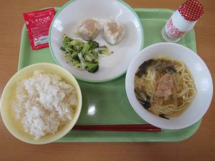 かにシュウマイはほんのりかにの風味が感じられました。サッポロラーメンは、具がたくさん入っていておいしかったです。炭水化物が二つもあったけれど、しそかつおふりかけのおかげで、ごはんが進み残さず食べられました。 給食委員長 出戸