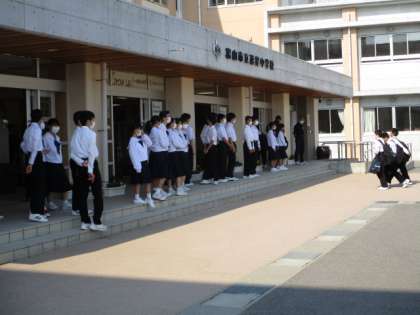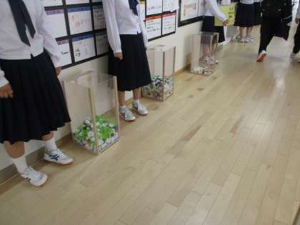 6月9日(水) 登校風景 公開日 2021/06/09 更新日 2021/06/09 全学年 今朝は雲一つない天気でした。玄関ではフェンシング部が挨拶運動をしています。玄関の中ではボランティア委員会の生徒が、ペットボトルキャップとインクカートリッジを集めていました。今日の下校完了時間は、16:55です。