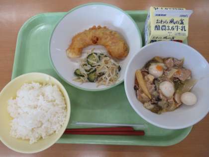 ごはん 牛乳 かぼちゃの天ぷら 甘酢和え 八宝菜