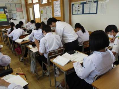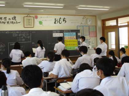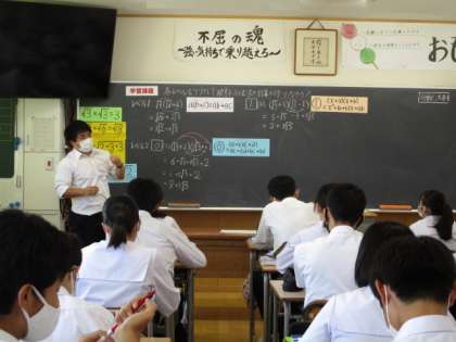 6月10日(木) 教育実習生研究授業 公開日 2021/06/10 更新日 2021/06/10 全学年 5限、33Hで教育実習生の数学の研究授業が行われました。根号を含む計算式を学ぶ内容です。段階的にレベルが上がる練習問題に、生徒は懸命に取り組んでいました。