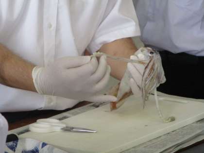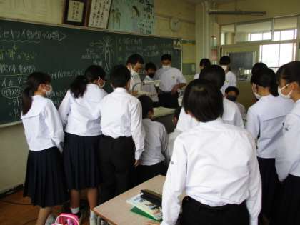 6月11日(金) 学校公開授業風景1 公開日 2021/06/11 更新日 2021/06/11 全学年 2限、19Hの理科は、無セキツイ動物の分類の学習でした。その中で実物のイカの解剖が行われました。生徒たちは興味津々です。