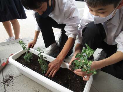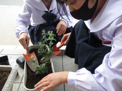生徒会執行部では、花言葉が「信じあう心」であるブルースターの苗を植えました!!伝統である「信じあう心」の象徴として、早く玄関前に咲き誇ってほしいです。