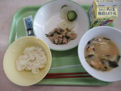 ごはん 牛乳 すいとん かぶのいろどり 豚肉の塩こうじ炒め のり佃煮