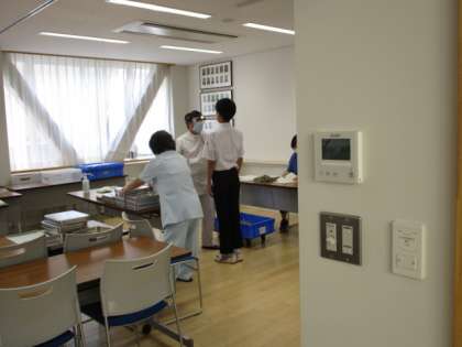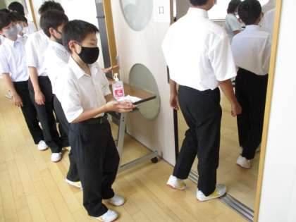 午後から1年生と25〜29Hの耳鼻科検診が行われました。生徒は検査前に手指の消毒を行ってから検査室に入ります。