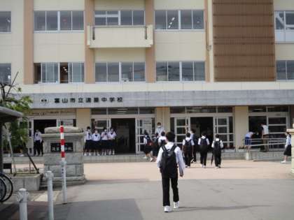 今朝は少しむし暑く感じました。玄関では演劇部が挨拶運動をしています。今日の下校完了時間は16:30です。